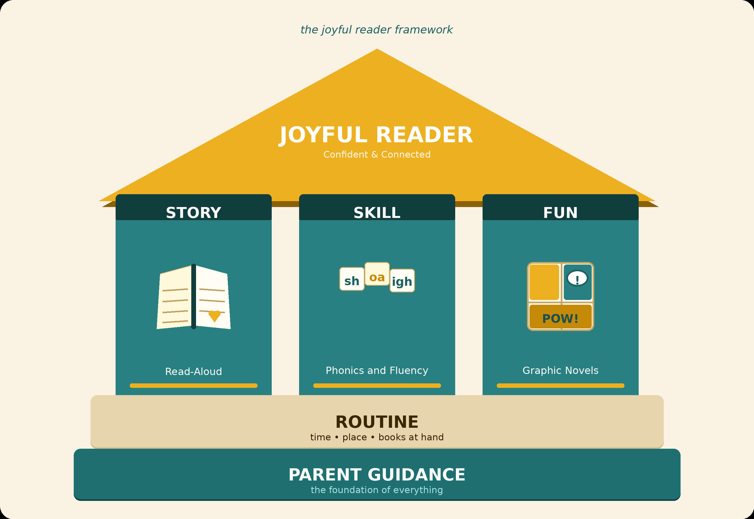 The Joyful Reader Framework is built on three pillars: Story, Skill, and Fun, all anchored by consistent routine and parent guidance.